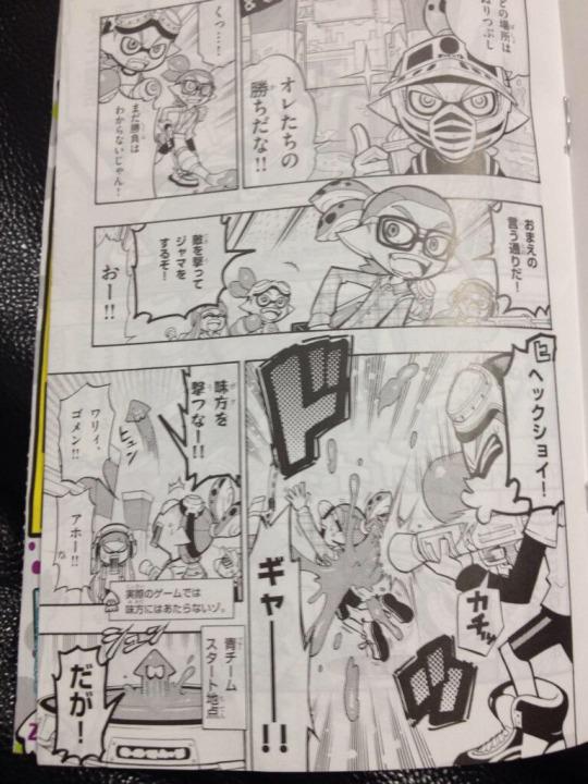 Complaints are already flying on Twitter and various forums that the fact that Squid Girl artist Masahiro Anbe wasn’t used was a wasted opportunity, but it seems like the resident CoroCoro artist has done a solid job at capturing the ink-based action. Admittedly, it’s a strange choice not to print this in colour, considering how big a role the ink colours play in the game.